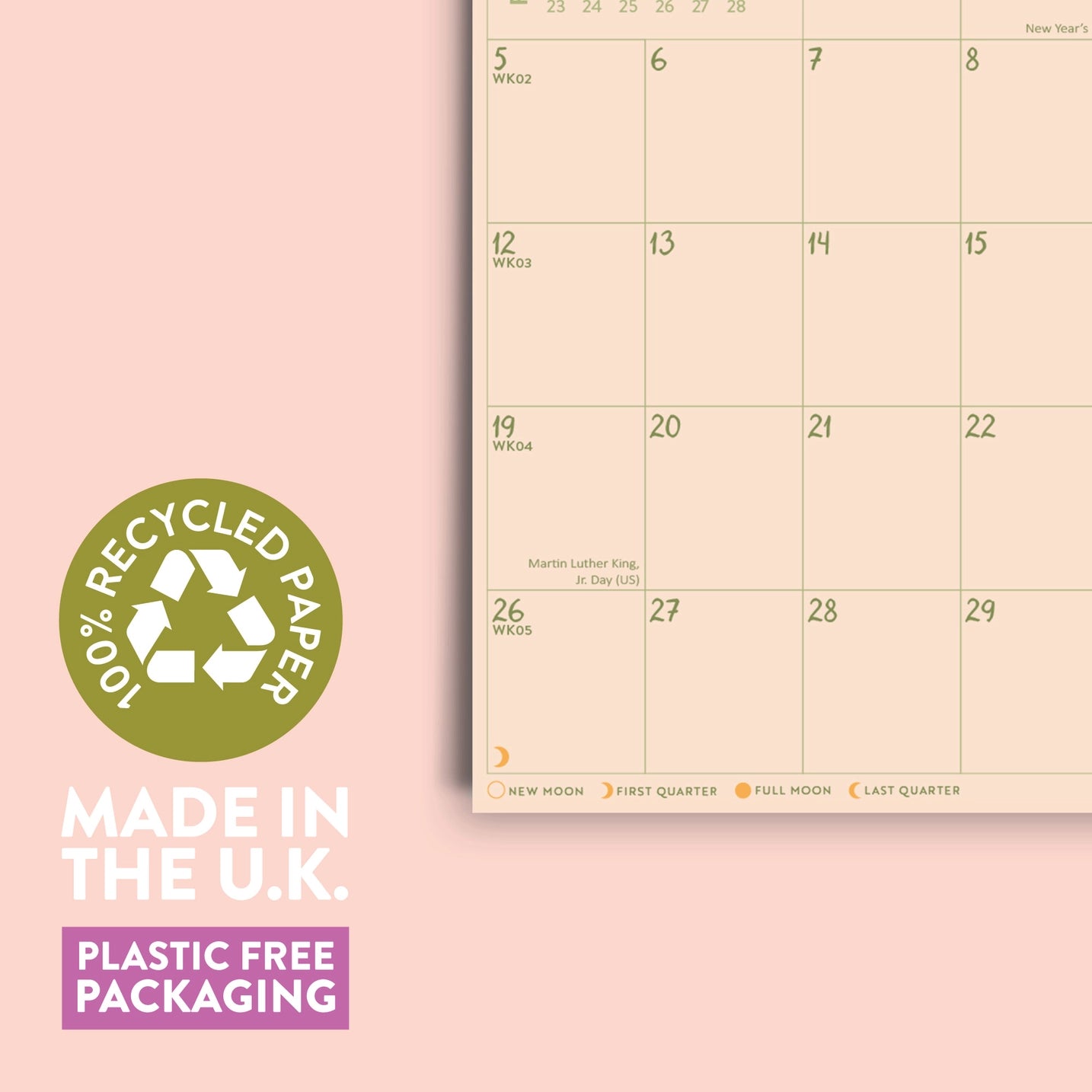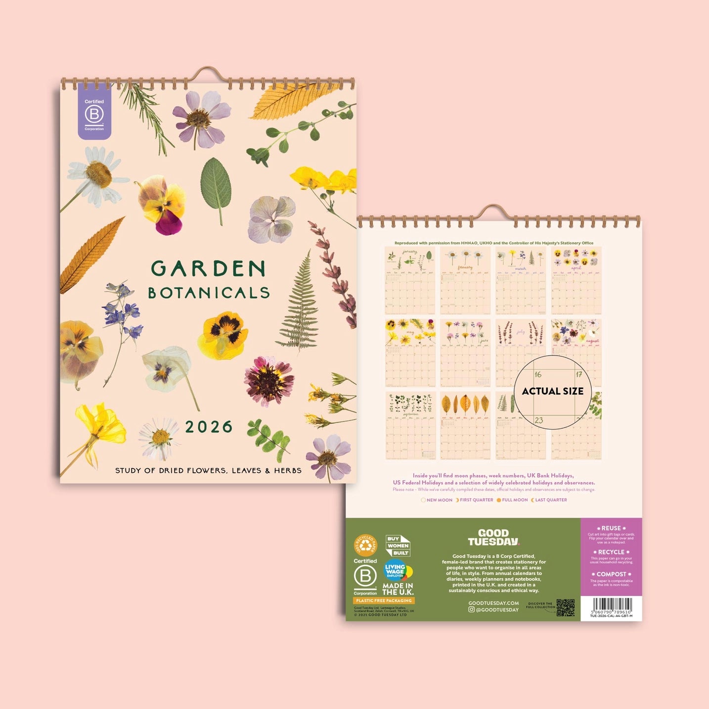 A 2026 Hanging wall Calendar for nature lovers - inside you'll find glimpses of nature captured through dried flowers, leaves and herbs - each of the 12 months features delicate florals or greens. A neutral grid with space to write appointments, events and other important dates. As always, designed and printed in the UK on 100% recycled paper