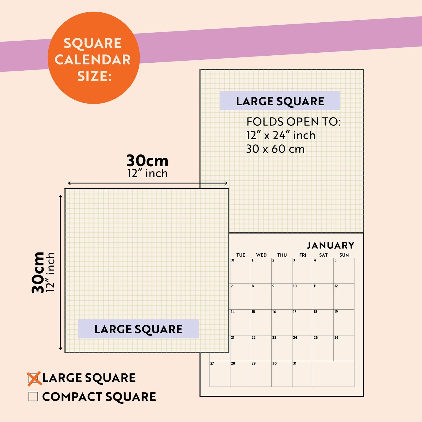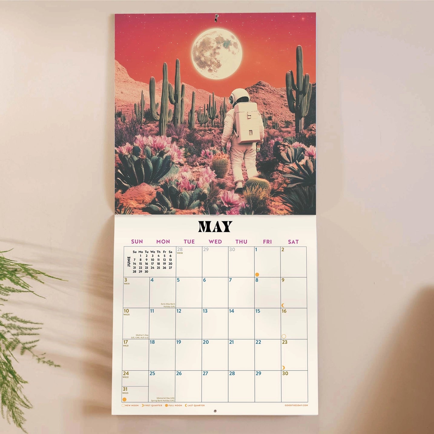 Surreal, cosmic, and bold. This 2026 wall calendar features retro-futuristic artwork in a large LP format, with Sunday-start month-to-view grids. Includes UK & US holidays, week numbers, moon phases, and space to plan your year