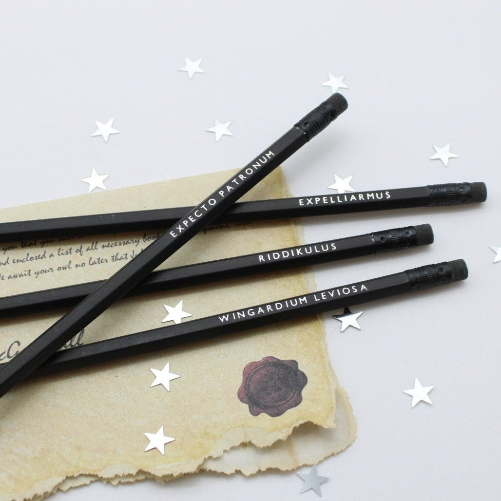 The Harry Potter pencils are printed on black pencils, each printed with the capitalised text in shiny foil.