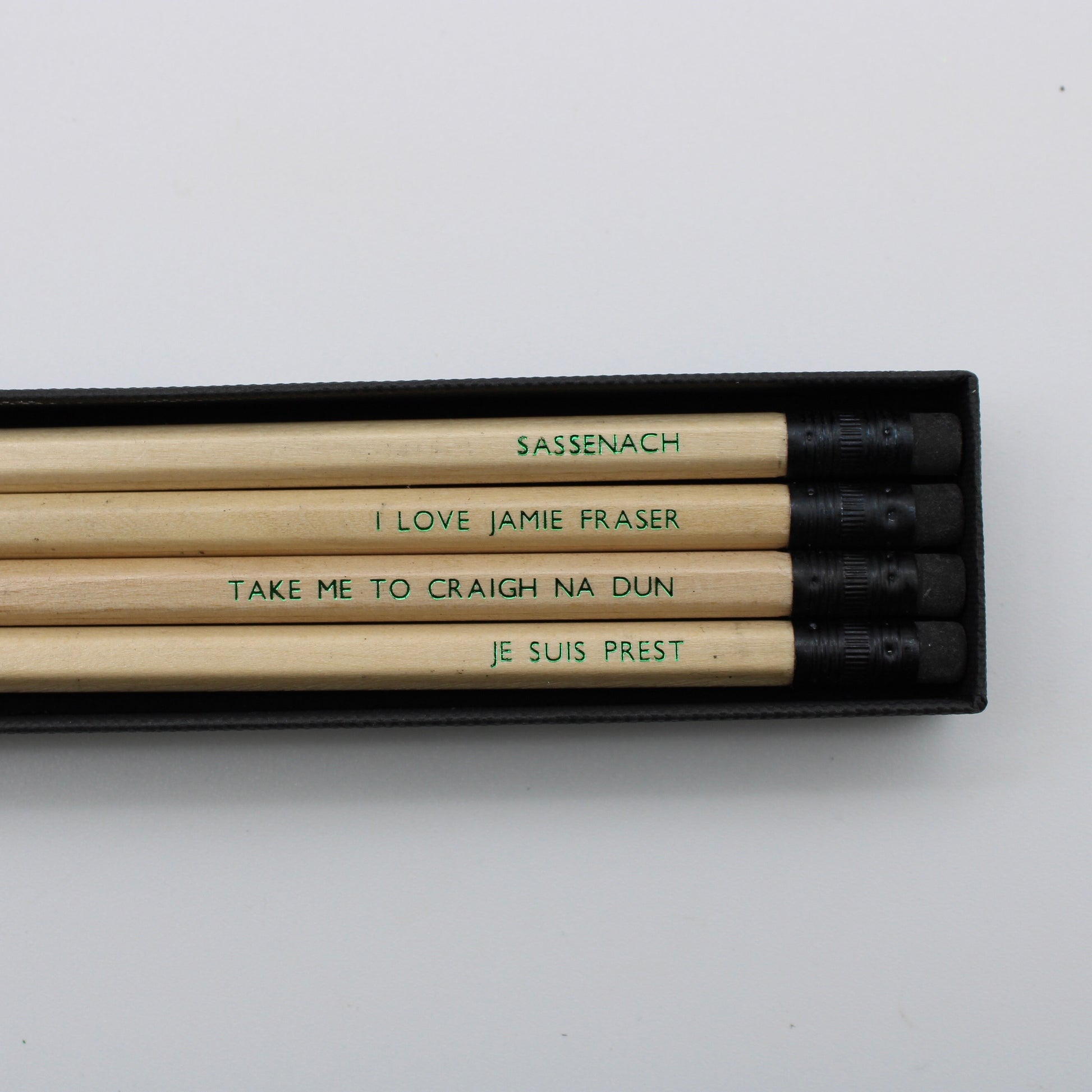 The Outlander pencils are printed on natural pencils, each printed with the capitalised text in green foil.
