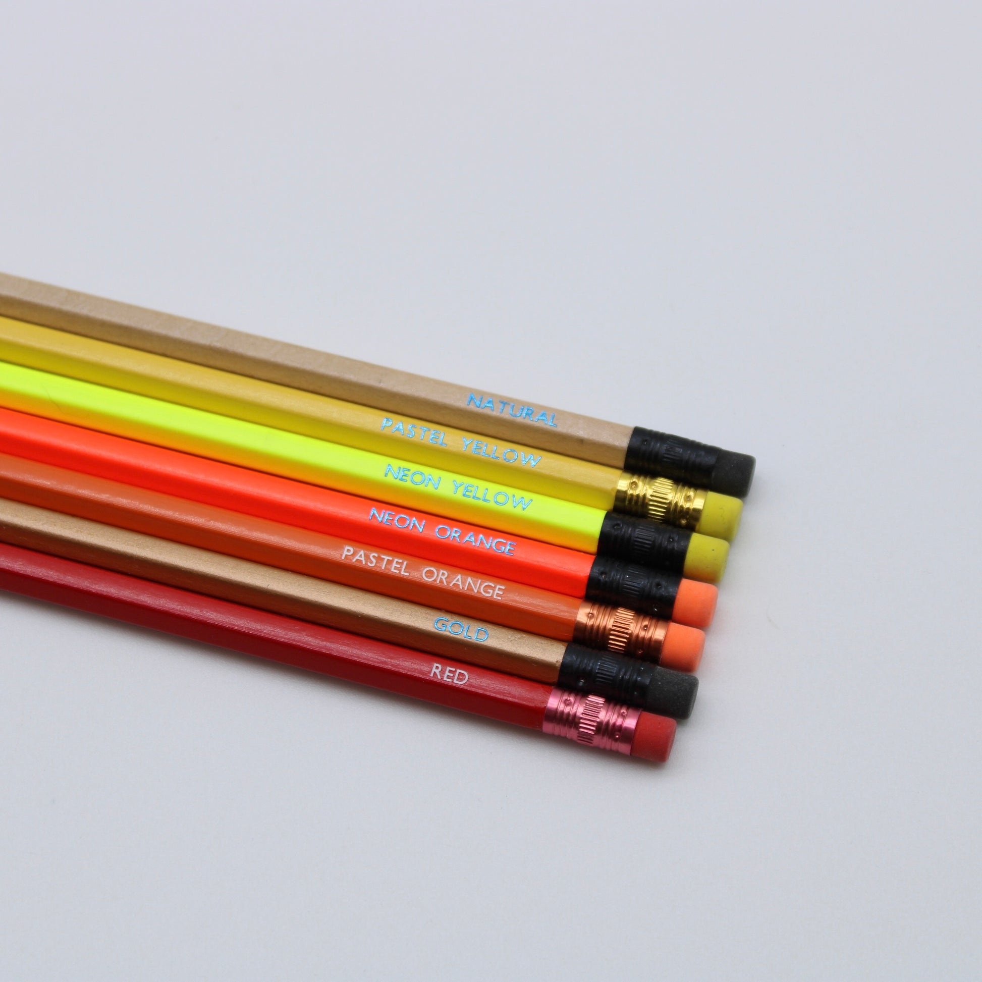 All the custom printed pencils have a 2B graphite lead and really good rubber that doesn’t leave dodgy marks. There are 20 different colours to choose from (see below), however during busy times some colours may be out of stock.